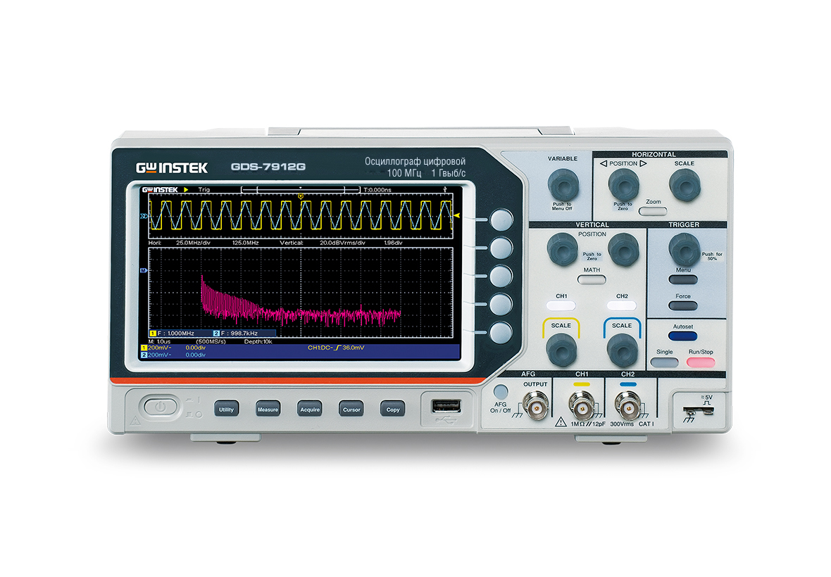 | Особенности | частота дискретизации 1 ГГц/ кан на длине записи 1000 точек. Встроенный генератор СПФ - 1 канал (до 25 МГц), 4 базовых и 16 форм сигналов произв. формы, ЦАП 14 бит, дискретизация 125 МГц. Автоизмерения (30 параметров), курсорные измерения, функции математики - сложение, вычитание, умножение, деление. Режимы сбора данных - выборка, пиковый детектор (>2,5 нс), усреднение (4 … 128), ZOOM (растяжка). Частотный анализ (БПФ) на участке 2048 точек (с.к.з./ дБ). Внутренняя память 16 осциллограмм, 8 профилей настроек, 6-разрядный частотомер |