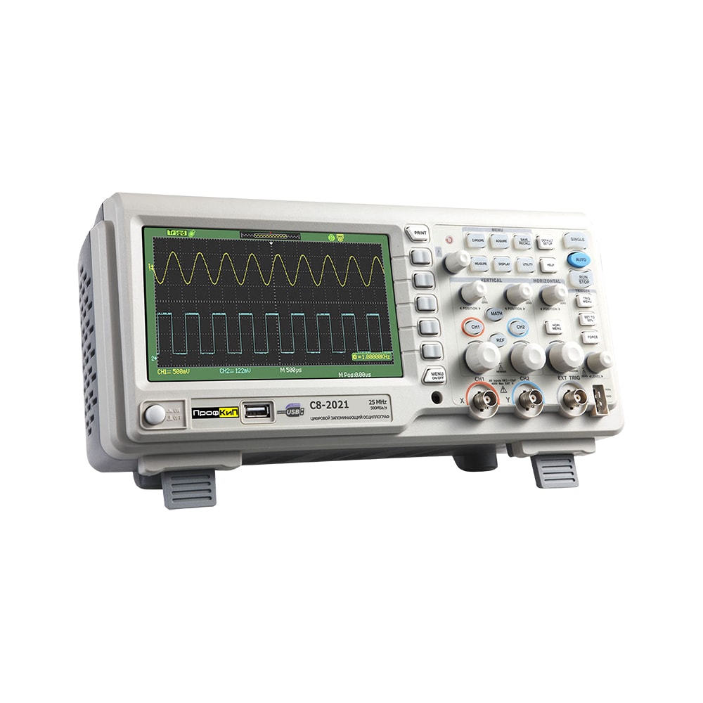 Осциллограф цифровой ПрофКиП С8-2073 – это компактный настольный двухканальный цифровой осциллограф с полосой пропускания 70 МГц. Семи дюймовый цветной жидкокристаллический TFT дисплей осциллографа обеспечивает яркое и четкое отображение осциллограмм, а кнопки с подсветкой обеспечивают удобство пользования.